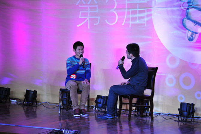 (选手时成帅与现场嘉宾教务处主任张圣兵老师)
