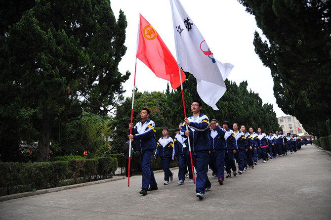 下午4点30分,高一年级全体学生身着校服,胸前佩戴共青团团徽,高举团旗和校旗,在政教处主任曹耀忠老师、管维新老师、孙钢老师和高一年级主任从晓老师以及各班班主任的带领下,排着整齐的队伍步行来到通州区烈士陵园。