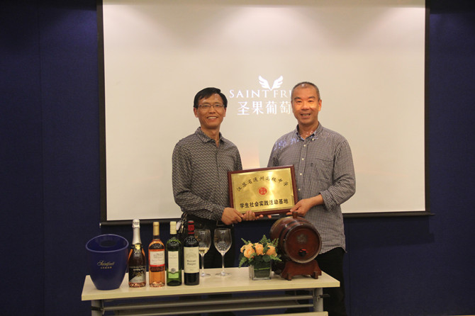 随后,同学们在会议室认真聆听了工作人员的讲解,从葡萄酒的历史到葡萄酒的分类,从酿酒葡萄的品种到酒杯的选择,无不使同学们大开眼界。热热闹闹的自由提问环节,同学们积极参与其中。政教处主任曹耀忠老师将“社会实践活动基地”的铜牌赠与了“圣果”公司。