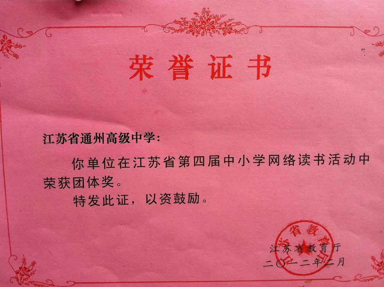 我校在江苏省第四届中小学网络读书活动获奖 时间:2012-07-10 浏览:次 分享到: 日前,从省教育厅传来消息,我校参加江苏省第四届中小学网络读书活动喜获多项奖励。1人获金奖,2人获银奖,多人获等级奖,9名指导老师获优秀指导教师奖,买球(中国)荣获团体奖。图为团体奖证书。 打印正文 关闭本页 扫一扫关注通州高级中学