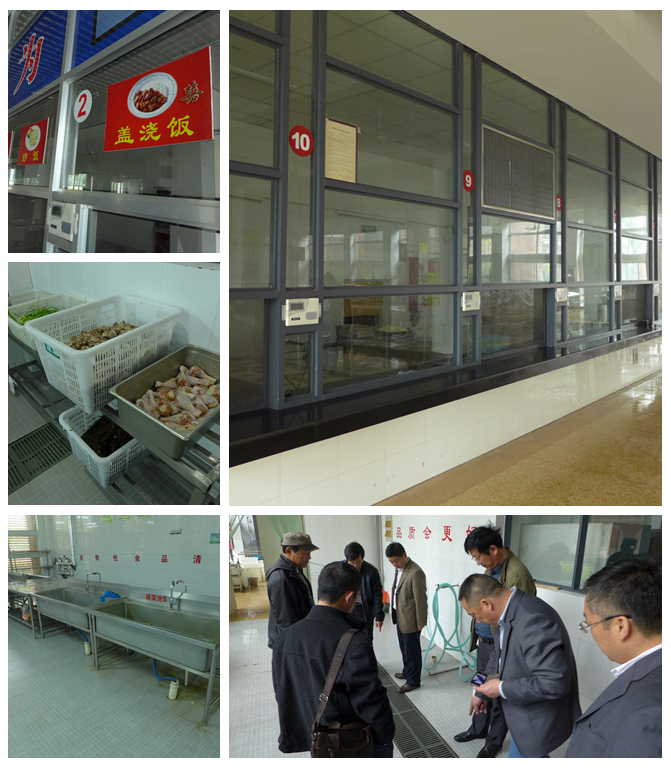 在食堂,从餐厅看到操作间,从食品分捡台看到清洗水池。