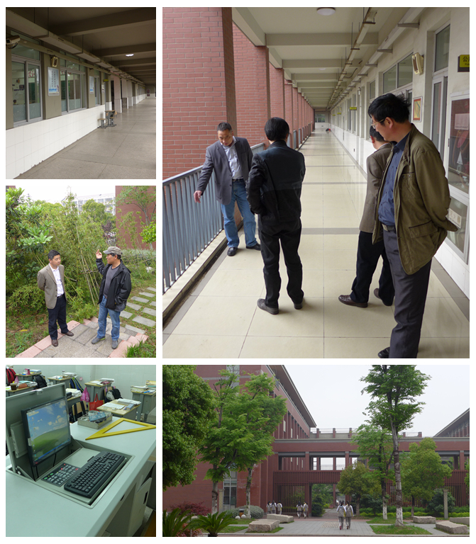 在教学区,我们考察了庭院绿化,还丈量了走廊宽度,拍摄了教室设施以及储物间。
