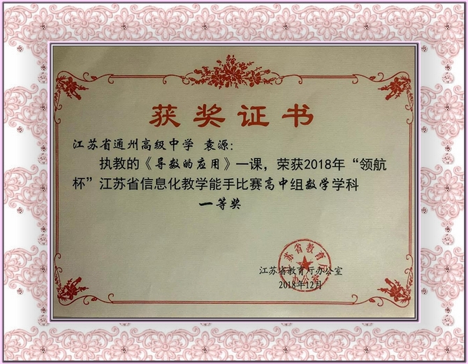 12月4-7日,由省教育厅主办,省教育信息化中心承办的2018年 “领航杯”江苏省信息化教学能手比赛在镇江举性。我校袁源老师在比赛中脱颖而出,荣获高中数学组一等奖第一名。