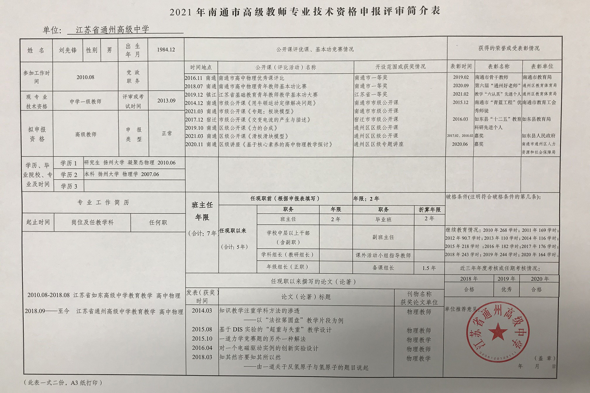 刘先锋拟申报高级教师简介表公示