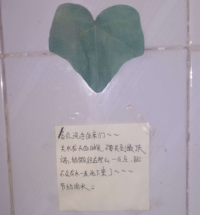 便笺纸上写着——各位洗手的亲们:关水龙头的时候,不要关到最顶端,稍微往右那么一点,就不会有水一直流下来了……节约用水!