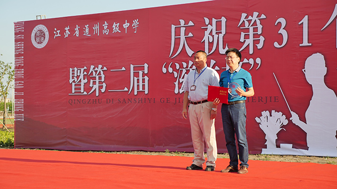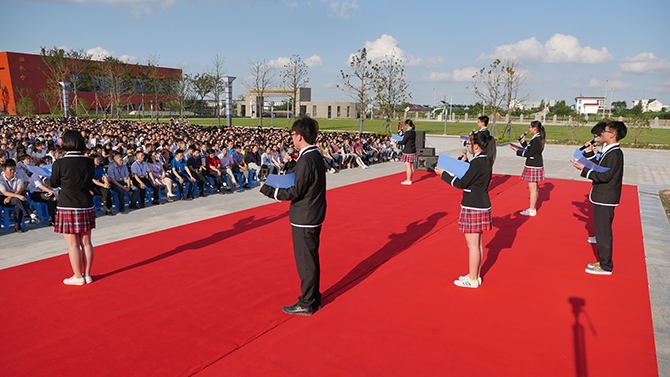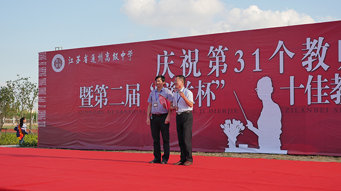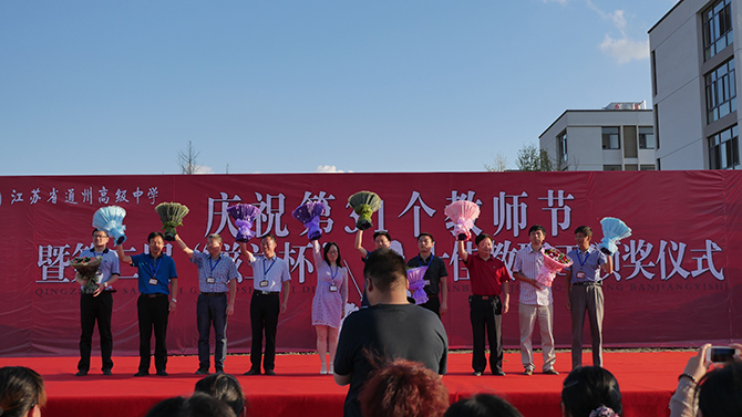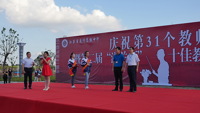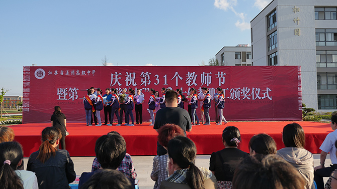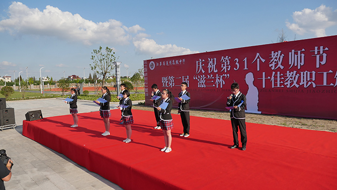 大会上,季仲平校长作了教师节致辞,并与党委书记曹光明,副校长许斌、秦志强、张圣兵一起为十佳教职工颁奖,侯卫东老师代表十佳教职工发表获奖感言。颁奖过程中,学生艺术团以诗朗诵的方式表达了对教师的感恩;每个班级为课任老师制作了精美的感恩卡,由工会主席曹耀忠老师随机抽取,学生主持人现场诵读并赠予礼品。