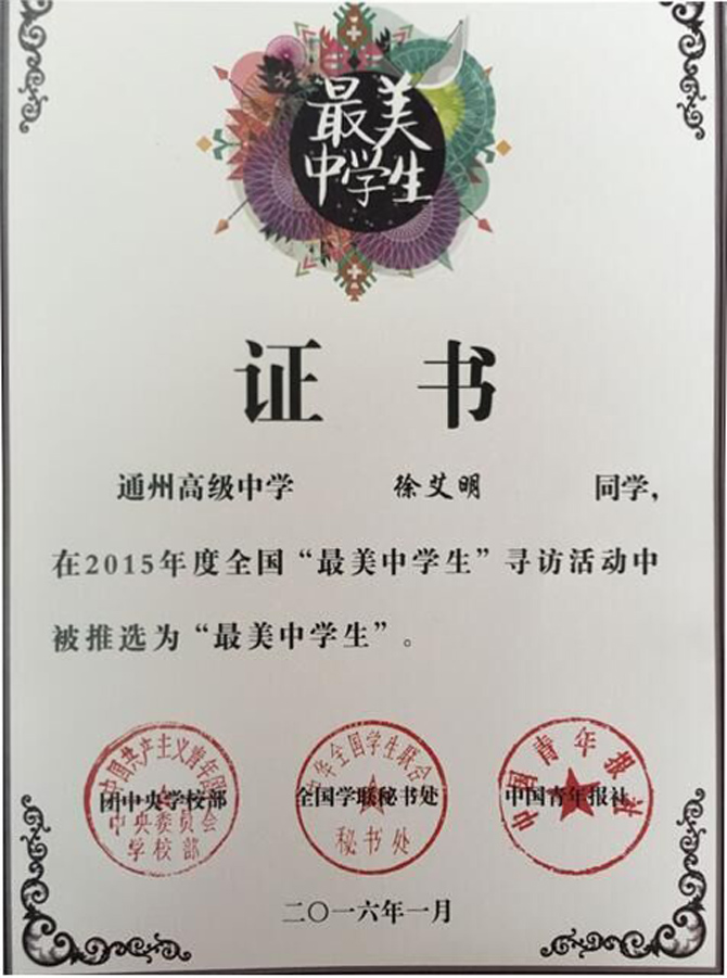 为积极培育和践行社会主义核心价值观,深入挖掘和宣传表彰学生先进典型,充分发挥先进典型的示范引领作用,在全社会营造促进学生健康成长的良好环境,引导青年学生按照习近平总书记提出的“勤学、修德、明辨、笃实”的要求健康成长,团中央买球(中国)部、全国学联秘书处联合中国青年报社于2015年6月起在全国寻访一批树立和践行社会主义核心价值观的“最美中学生”,寻访在热爱祖国、勤奋学习、科技创新、技术技能、志愿服务、热心助人、见义勇为、诚信友善、孝老爱亲、自强自立等方面表现突出的中学生和中职学生。经过层层推荐,我校高三(8)班徐艾明同学脱颖而出,被授予全国“最美中学生”称号。