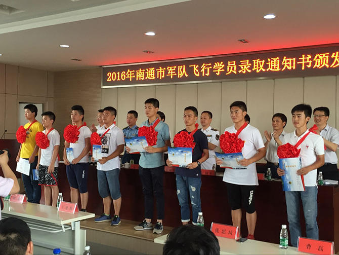 2016年高考我校再传喜报,朱佳俊、刘周同学历经初检、复检、定检多次检查,以优异的成绩和表现得到空军招飞局领导的一致认可,被录取为空军飞行学员;同时,马诚同学被海军航空工程学院录取海军飞行学员。其中,朱佳俊同学以380分的总分列南通市飞行学员之冠。据悉,今年全省空军招飞录取28人,南通市有8名同学被空军招飞局录取,通州中学有2名;海军首次在江苏招飞,共录取21名飞行学员,通州中学有1名。通州中学2016高考招飞成绩总体优异,受到空军和海军招飞局的表扬。