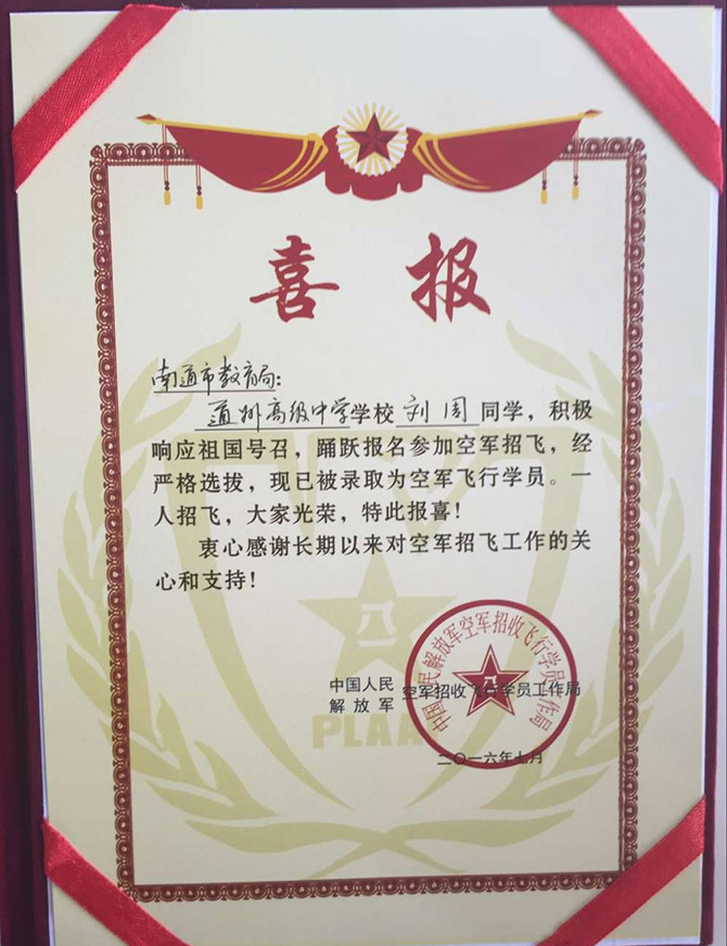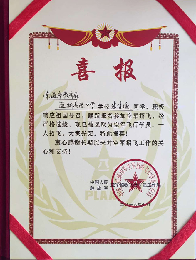 我校向关心支持空军招飞工作的各位首长、辛勤培养朱佳俊、刘周、马诚等三位同学的各位老师表示由衷的感谢,对三位同学及其家长表示热烈的祝贺,希望他们继续发扬通州高中精神,刻苦训练,勇敢擎起捍卫祖国万里长空的使命。买球(中国)号召有志于献身国防事业、报考飞行员的同学,做好准备,争取早日加入护卫蓝天的空中雄鹰行列。