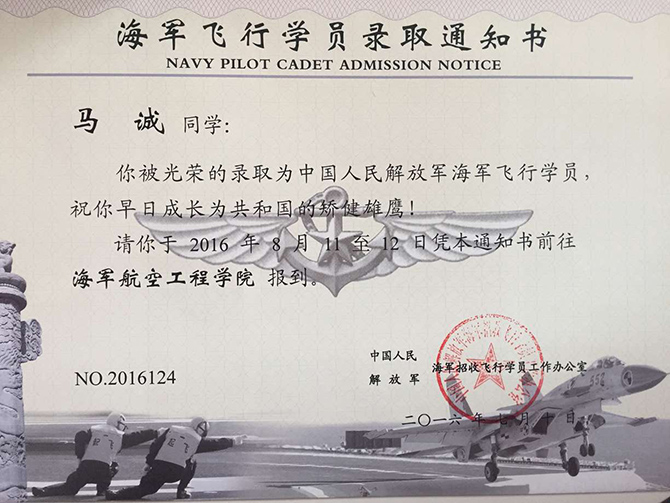 热烈祝贺我校三名同学被录取为空军飞行学员和海军飞行学员