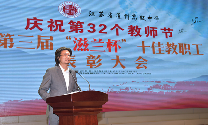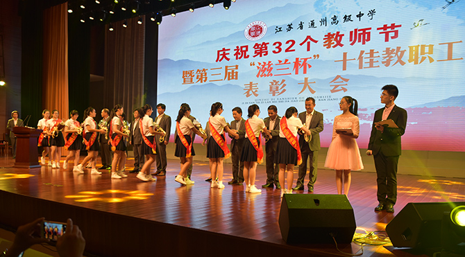活动由一派艺术范的美术老师张伟主持,在全场雄浑的国歌声里拉开了序幕。张伟老师娓娓地讲述着通州高中温暖的故事,伴随着买球(中国)学生社团校园电视台拍摄的纪录片《礼物》,在学生主持人诵读颁奖词的导引下,第三届滋兰杯十佳当选者登上舞台,他们是:王红、江振宇、杨佩娟、季爱民、金新革、高剑波、徐淑芬、曹耀华、李汉栋、宋启广。当张伟老师报出十位颁奖嘉宾——已经离退休的老同志时,全场响起了经久不息的掌声。说起获奖感言,十佳教职工代表王红老师深情的说“几十年教师的感悟就是教育就是一场温暖的陪伴”,金新革老师则在一场幸福的感动中感谢着所有的人,期望与大家一起打造通州高中更美好的明天。王磊同学的一曲《逝去的歌》表达了同学们对老师们过去付出的记忆。