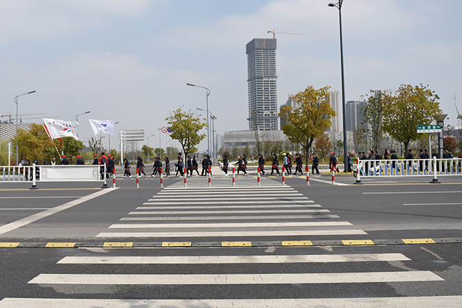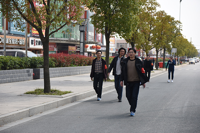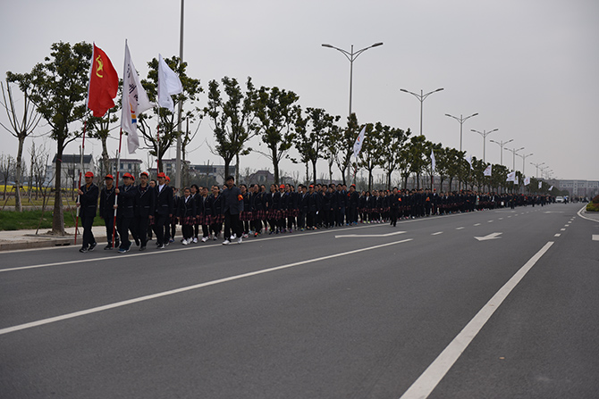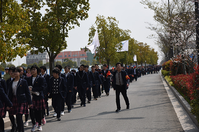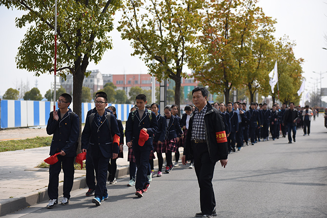 中午12点30分,鹏举广场上队列整齐,班旗飘扬。在季仲平校长激昂致辞后,在团旗和校旗的引领下,我们踏上了征程,开始了15公里的徒步之行。除班主任之外,很多老师陪同随行,交警和体育老师全程护送,整个队伍一路绵延,二十面班旗掩映着我们的身影。老师们便装球鞋,全没了课堂的严肃,欢声笑语,步伐矫健。季校长一直走在队列的外侧,呵护着我们的安全。有同学冲口而出:“季校长,您这是要陪我们走全程吗?”他轻笑出声,我们也笑了,