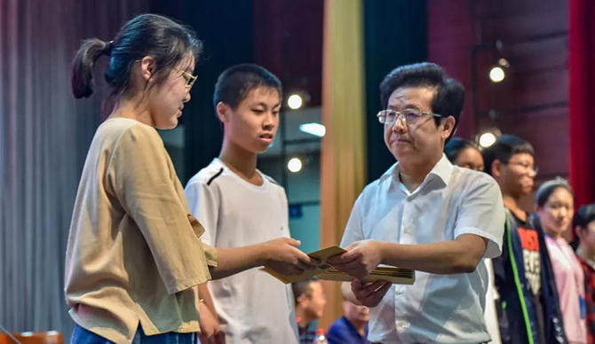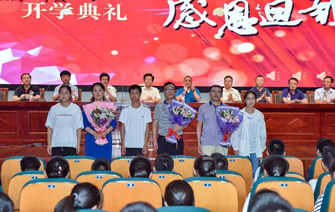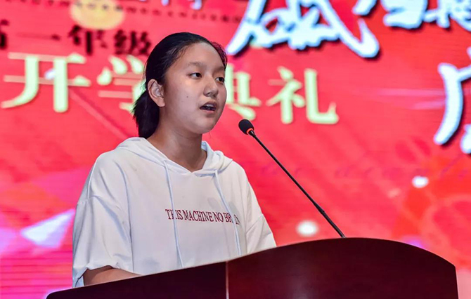 入学典礼在嘹亮的国歌声中开始,季仲平校长首先给录取我校的中考全区前十名同学颁发了“华伟”奖学金,以此鼓励全体高一新生砥砺奋进,继续前行。高一6班王乐章同学在代表发言中表示,要树立远大理想,在美丽通高,与大家共赴一场“遇见”,让自己成为最好的自己。