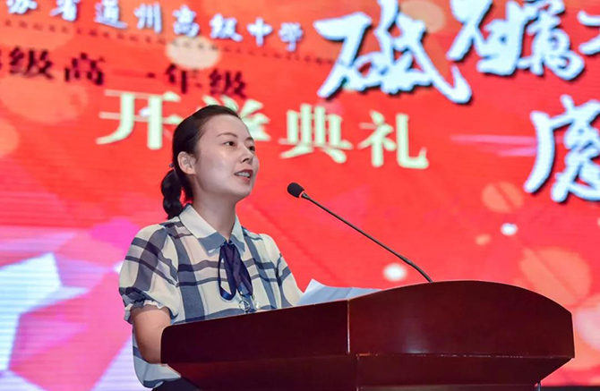 王冰心老师代表高一教师发言,她表达了对同学们跨进通高大门的祝贺,鼓励大家珍惜现在,努力奋斗。她说:只有养成良好的学习习惯,才能翱翔蓝天飞向远方;养成良好的生活习惯,才能为腾飞插上坚强的翅膀;树立远大的人生理想,才能谱写青春时代壮丽华章。