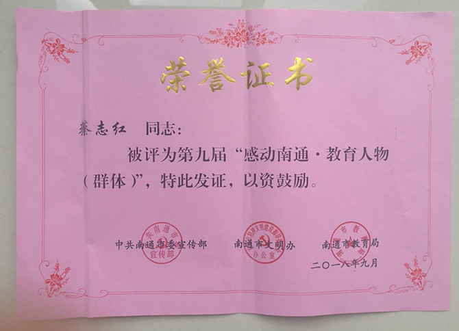 第三十四个教师节之际,我校心理健康教育老师蔡志红被评为第九届感动南通教育人物。心理健康教育工作是直抵学生心灵的工作,是专业性很强的工作。蔡志红老师立足高中心理健康教育岗位,以身立教,以人育人,以心育心。在平凡的工作岗位上,她充分发挥教书育人的积极性、创造性,以真心、爱心、责任心上好每一堂心理健康教育课,接待好每一个寻求心理帮助的学生及其家长,积累了许多心理辅导以及咨询的成功案例,赢得了学生及其家长的高度赞誉,不少学生称她为“改变自己人生”的老师。近年来,蔡志红老师开展个别心理咨询超过5000小时,面对学生、家长、社区居民开展心理健康教育宣讲200多场,受益听众超过5万人。她先后获得江苏省中小学优秀共产党员、全国中小学心理健康教育卓越人才(教师)、通市心理健康教育学科带头人、南通市优秀志愿者、通州区优秀德育工作者等荣誉称号。