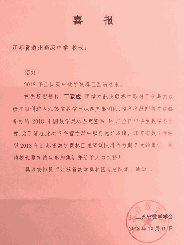 通过数学竞赛教练团队的不懈努力,每年在全国高中数学联赛(江苏赛区)中,我们都有不俗的表现。2018年,买球(中国)共有21名学生获联赛“江苏省一等奖”,2位学生获“赛区一等奖(国一)”,其中丁家成同学入选“数学竞赛江苏省代表队”。