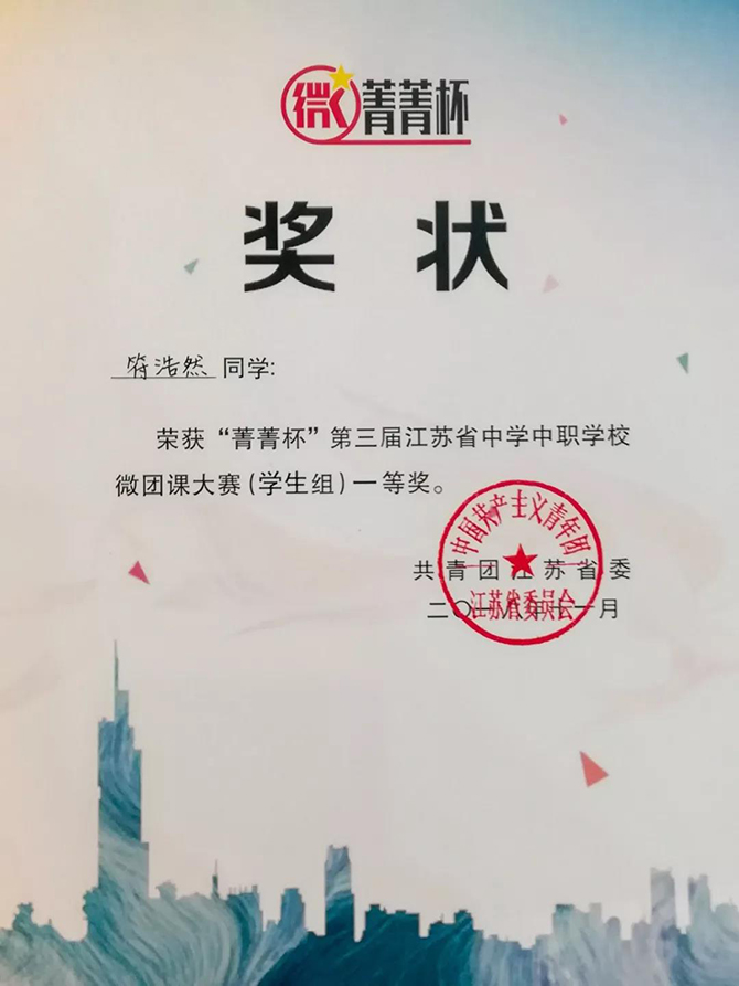 11月29日至30日,由共青团江苏省委举办的第三届“菁菁杯”江苏省中学中职买球(中国)“微团课”大赛决赛在南京举行。经过激烈角逐,我校高一(6)班符浩然同学作为南通市高中生代表荣获学生组一等奖。