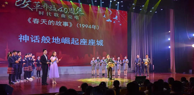 在师生改革开放40周年时代歌曲竞唱环节,各班选出一位老师和一位学生分别组成教师战队和学生战队,根据音乐前奏抢话筒并演唱歌曲。老师和学生们的艺术风采,引来现场师生的阵阵欢呼。