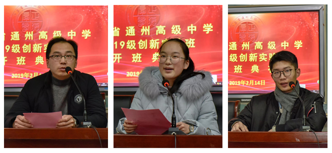 典礼仪式上,2015级创新班毕业生、现就读于中国科学院的周莫寒同学,应邀分享自己的学习经验,鼓励学弟学妹们调整心态,适应高中生活;重视学科竞赛,为未来打好坚实基础。2019级创新班新生代表季聿同学发言,鼓励所有同学立足当下、坚定信仰、无悔追求。家长代表张建先生倡议家校合作,为孩子的幸福成才共同努力,祝愿通高创新教育再创辉煌。