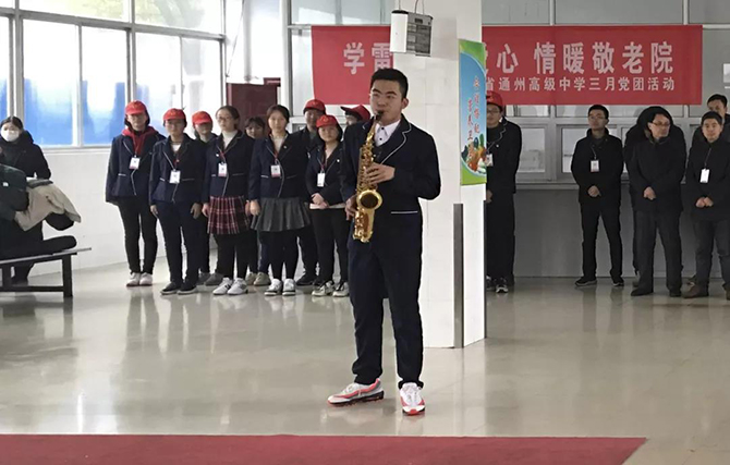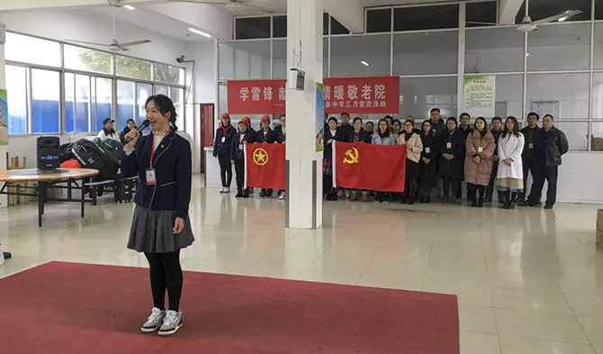 5日下午,天色微凉,细雨微蒙。同学们佩戴好志愿标志,老师们佩戴党徽,师生整齐列队,在校门口集合。随后大家乘坐校车来到高新区敬老院。学生志愿者们为老人表演了独唱、长笛演奏、诗朗诵等文艺节目,老人们沉浸其中,感受孩子们的祝福。教师党员代表给老人们分发慰问品、测量血压,室外天气虽然寒冷,但此时敬老院里暖意融融。