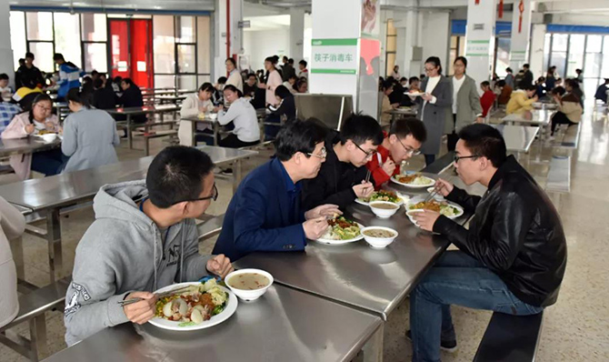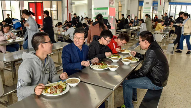 4月17日中午,一群最早到食堂吃饭的学生,欣喜地发现季仲平校长又在窗口等待他们排队用餐。几个大方的同学主动邀请校长坐在他们的餐桌旁,与校长共进午餐!季校长欣然答应,并热情为几位同学刷卡付费。