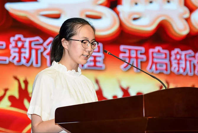 高一(6)班孙畅同学代表全体新生郑重承诺:在接下来的三年时间,会铭记父母希望,听从老师教诲,以优秀学长为榜样,牢记通高“正德厚学”的校训,传承通高精神,努力做一名优秀的通高学子。区重点初中三位校长上台,接受了优秀学生代表献花,全体高一同学用热烈的掌声表达了内心感恩。单丽梅老师作为教师代表发言,她希望同学们在高一起始阶段,把握时间,保持热爱,坚定自己的信念,培养刻苦钻研、不断创新的精神,领略学习的乐趣与魅力,不断探索、发现,取得更加优异的成绩。