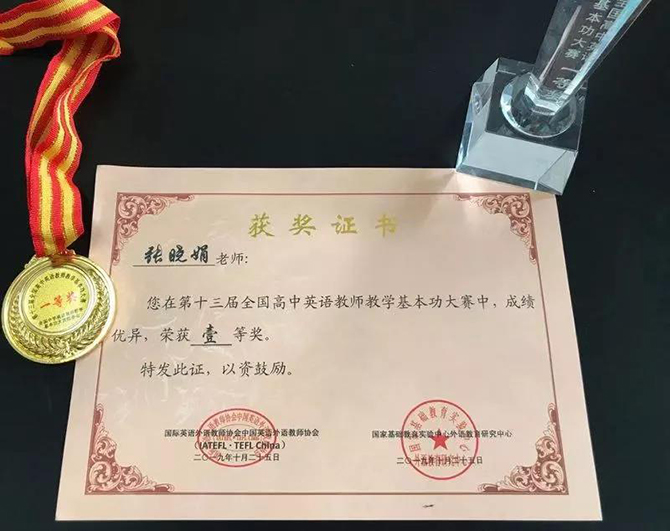 今天,从第十三届全国高中英语教师教学基本功大赛组委会传来喜讯,我校英语教研组青年教师张晓娟荣获课堂教学评比全国一等奖!