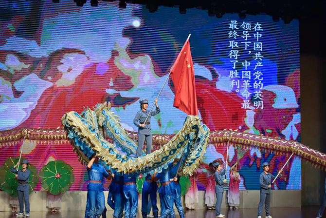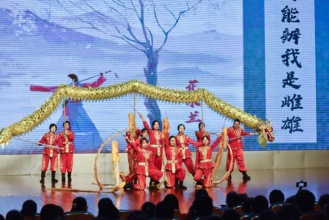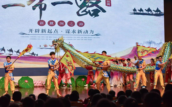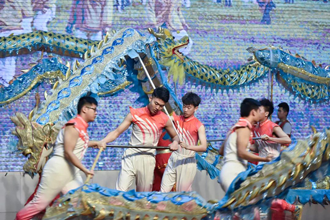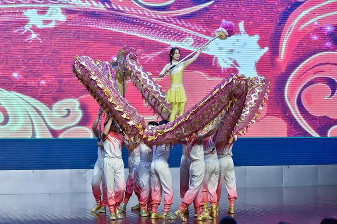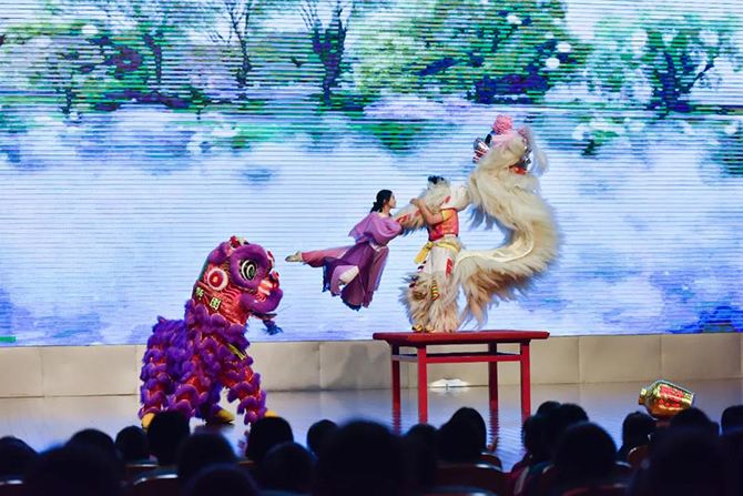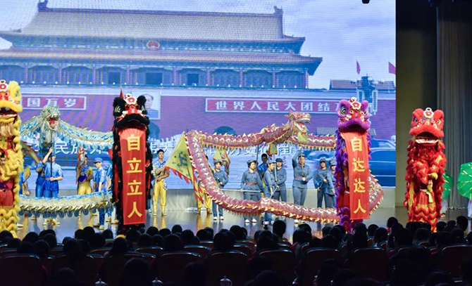 龙腾狮跃,这场展演传承了龙的文化与狮的精神。《骆山大龙》一展浩然正气;《龙腾华夏》仙子羽衣轻扬,祥龙逐珠矫健敏捷,表达了爱与和谐的主题;烟雨入江南,山色如墨染,菡萏初绽,荷花龙嬉戏,一场《江南烟雨》柔美温软;《一带一路》用龙狮文化演绎古丝绸之路的辉煌历史;《步步登高》是对通高学子的美好祝愿;刚柔并济的《花木兰》展现了巾帼英姿;《飞天》飞龙在天,纵横四海;《秦王点兵》鼓点昂扬,鼓声雄厚,敲响新时代的红色颂歌……最后一个节目《盛世华章——新时代》将整场演出推向高潮,七十年盛世华章,新时代青春嘹亮,节目用龙狮演绎新中国波澜壮阔的伟大历程,将爱党爱国主题融入其中。